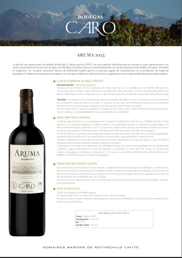 Aruma quiere decir ‘noche’ en quechua, la lengua de los Incas. Este nombre expresa la intensidad de las noches andinas y la profundidad del color que caracteriza a los Malbec.